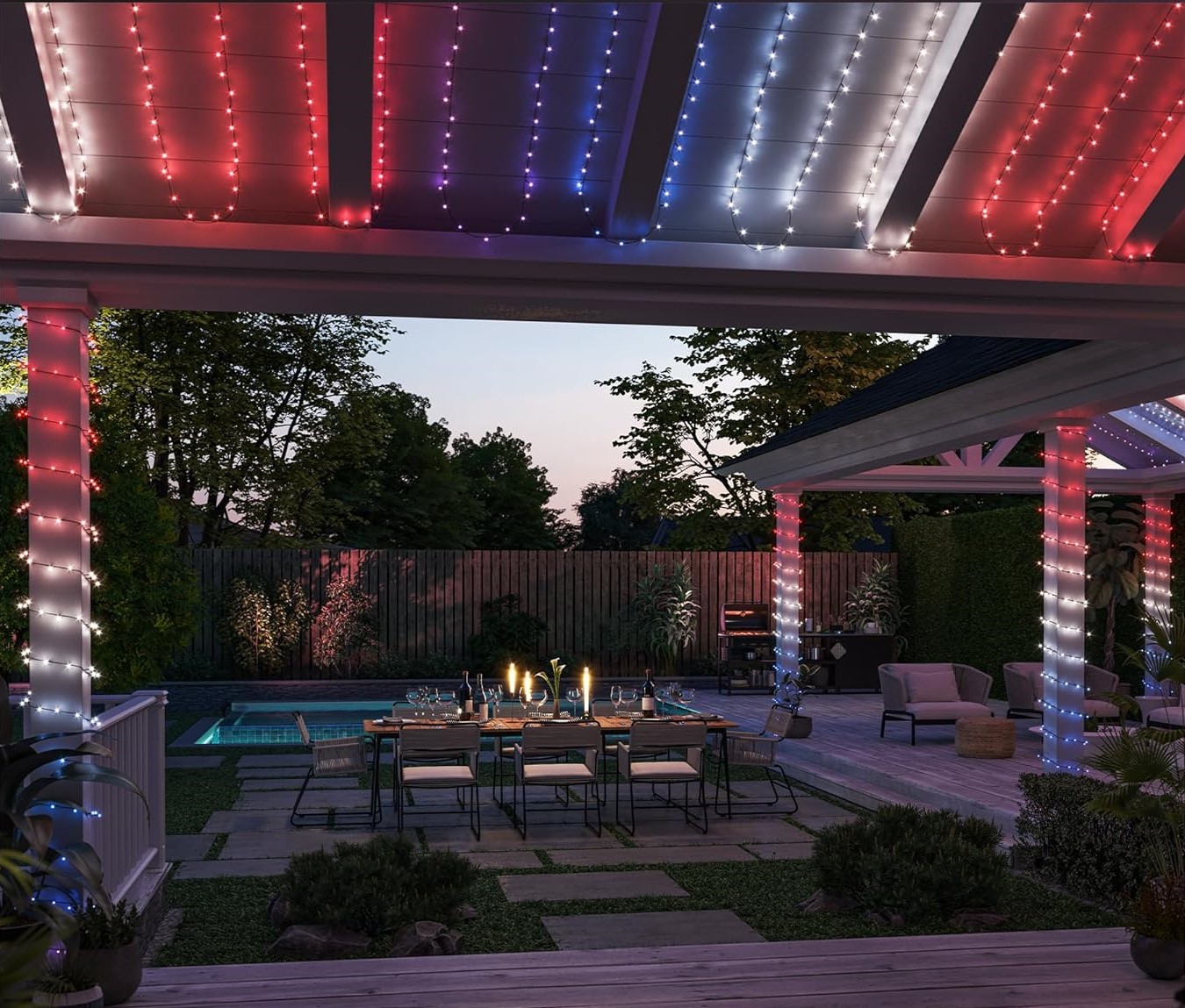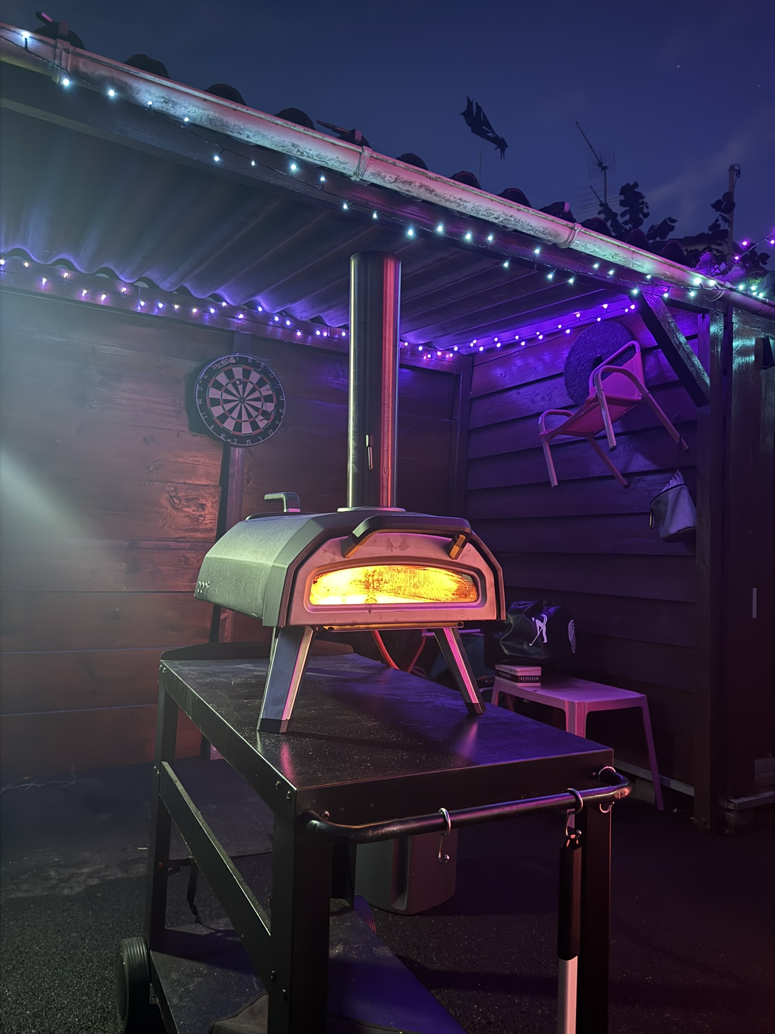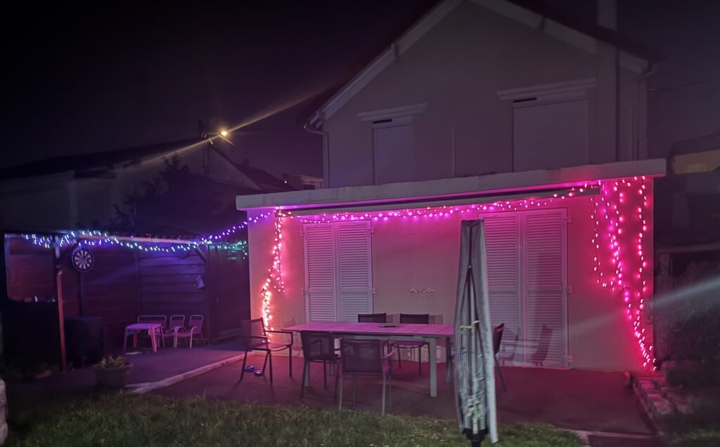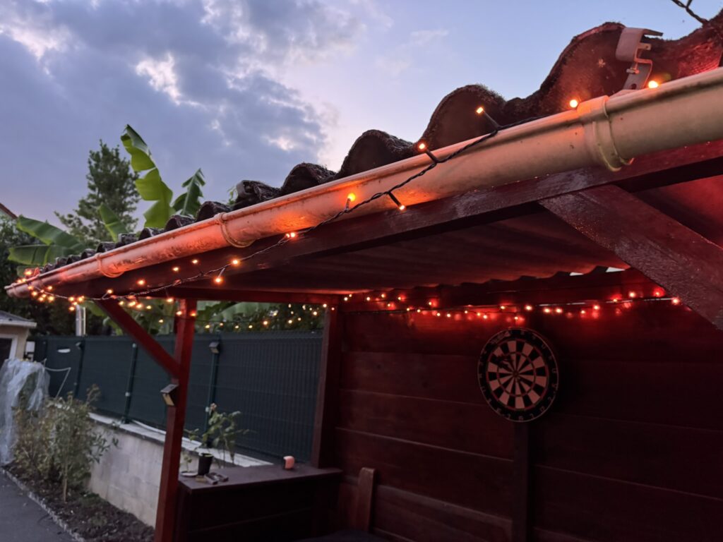 En effet on parle ici de 40 mètres de longueur. J’ai choisi de l’installer tout autour de mon store banne, puis sur mon abri en bois attenant à la terrasse. Je voulais que la guirlande reste bien en place, même lorsque je replie ou déplie le store. Après un peu d’ajustement le résultat est nickel. Idéalement, une pergola serait parfaite pour ce genre d’installation, mais même sans, ça rend très bien. Sur un balcon ça peut aussi avoir son petit effet