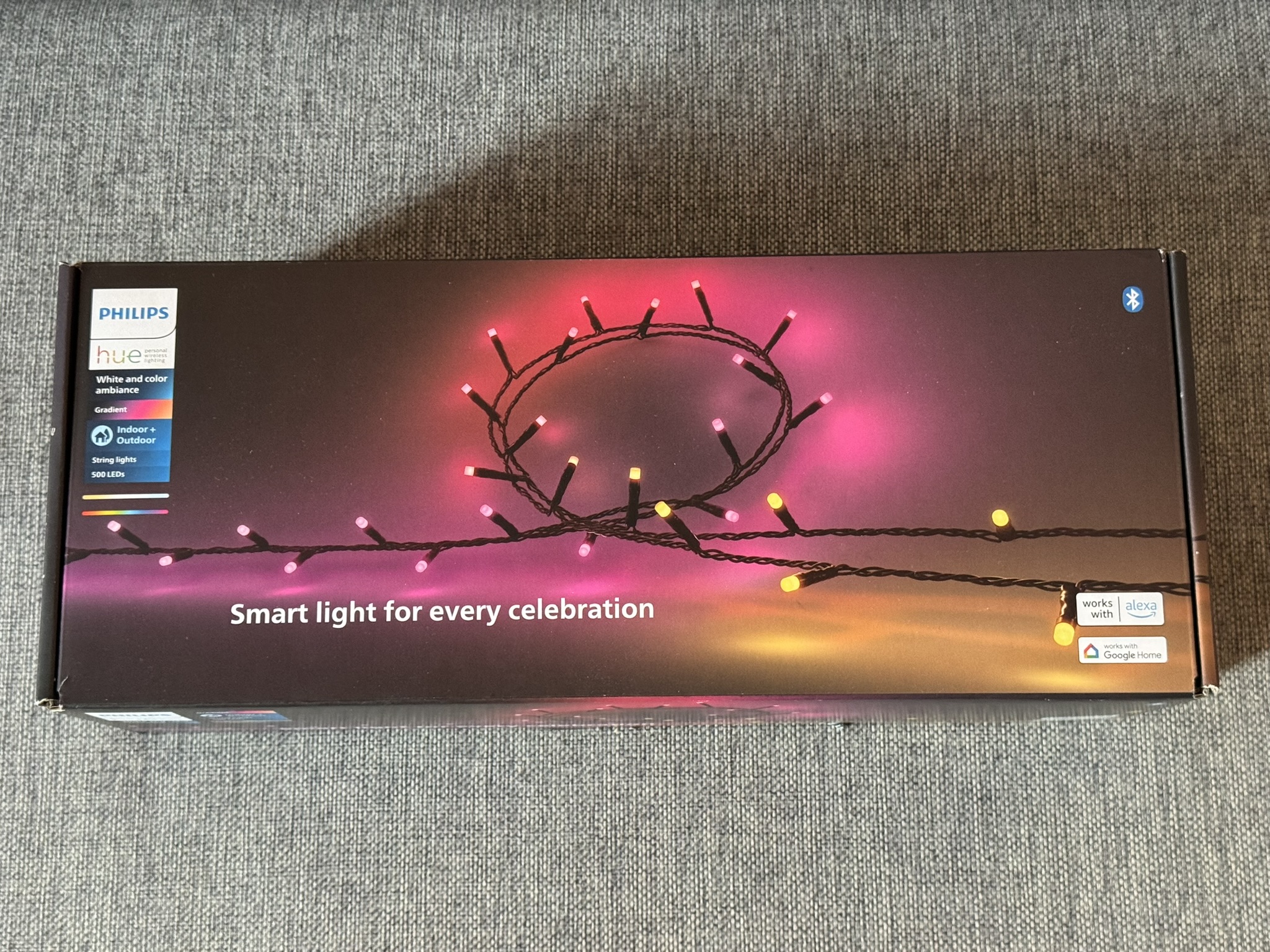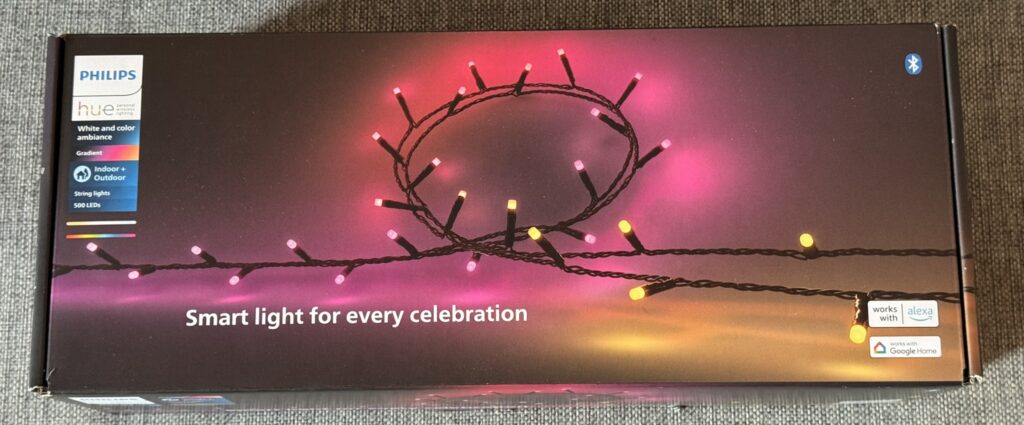 Chez moi, j’ai des dizaines de produits Philips Hue : des lampes, des bandeaux lumineux, même la télé Ambilight est compatible Hue… bref, j’en ai dans toutes les pièces. Mais pour l’extérieur, je cherchais un produit capable d’apporter à la fois de la lumière et une vraie ambiance. La gamme Festavia est connue pour sa version 100 LED pensée pour les sapins de Noël. Philips m’a proposé de tester la version extérieure, disponible en 250 ou 500 LED. J’ai reçu la version 500 LED et même si le colis n’est pas immense, il y en a pour une sacrée surface !