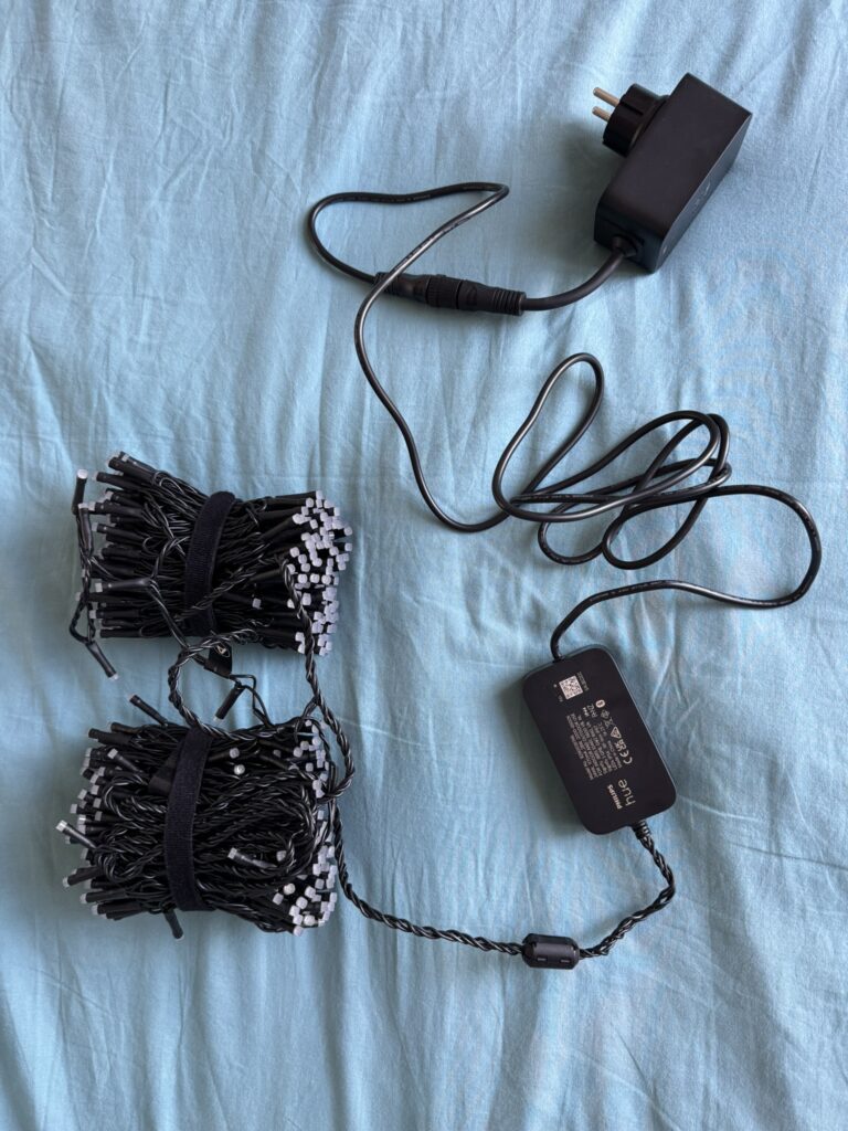 L’installation est simple et rapide, typique de Philips Hue. Il suffit de brancher le bloc d’alimentation (protégé IP44 donc résiste aux projections d’eau) et d’ajouter la guirlande via l’application Hue. L’ensemble est solide, bien fini et résiste parfaitement aux intempéries. Je l’ai depuis plusieurs mois et ni la chaleur estivale ni le froid de l’automne ne lui ont fait peur.