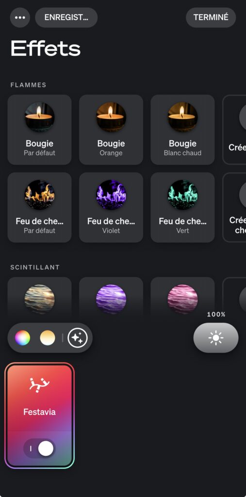 On peut aussi inverser le sens des couleurs, régler la vitesse et activer des effets dynamiques comme Bougie, Feu de cheminée, Étincelles, Ondulation (sous l’eau, cosmos), Rayons de soleil ou Boucles. Le rendu est franchement beau et bien dosé, sans tomber dans le kitsch.